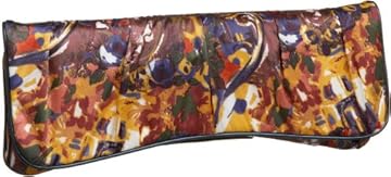 Let your artistic side shine with this eclectic and glamorous clutch from Giuseppe Zanotti. Made in Italy, the handbag's rich satin material features a lush design of swirled, splashed, and thickly layered colors for an appealing, painterly look. The east-west shape arches slightly at the bottom for a distinctive silhouette. The interior of the clutch continues the colorful pattern and also offers a durable nylon lining and a convenient zippered pocket. The top flap has a secure magnetic closure on the side. A dust bag is included for handy storage and protection.